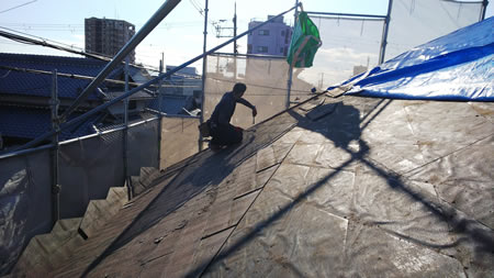 経年劣化による屋根からの漏水を止めるために、 屋根の葺き替え工事を行いました。 ▼ビフォー▼ 下地処理からしっかりやっていきます!! …